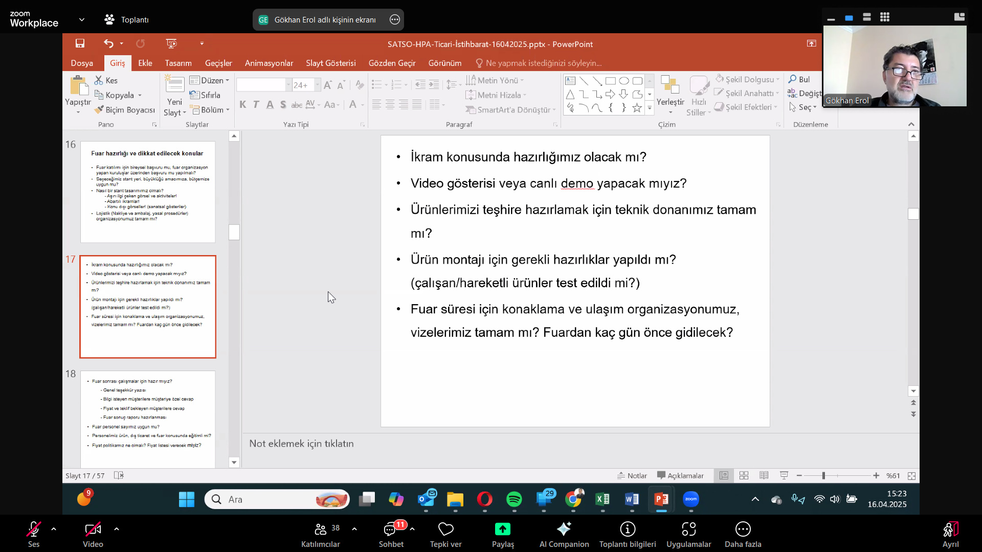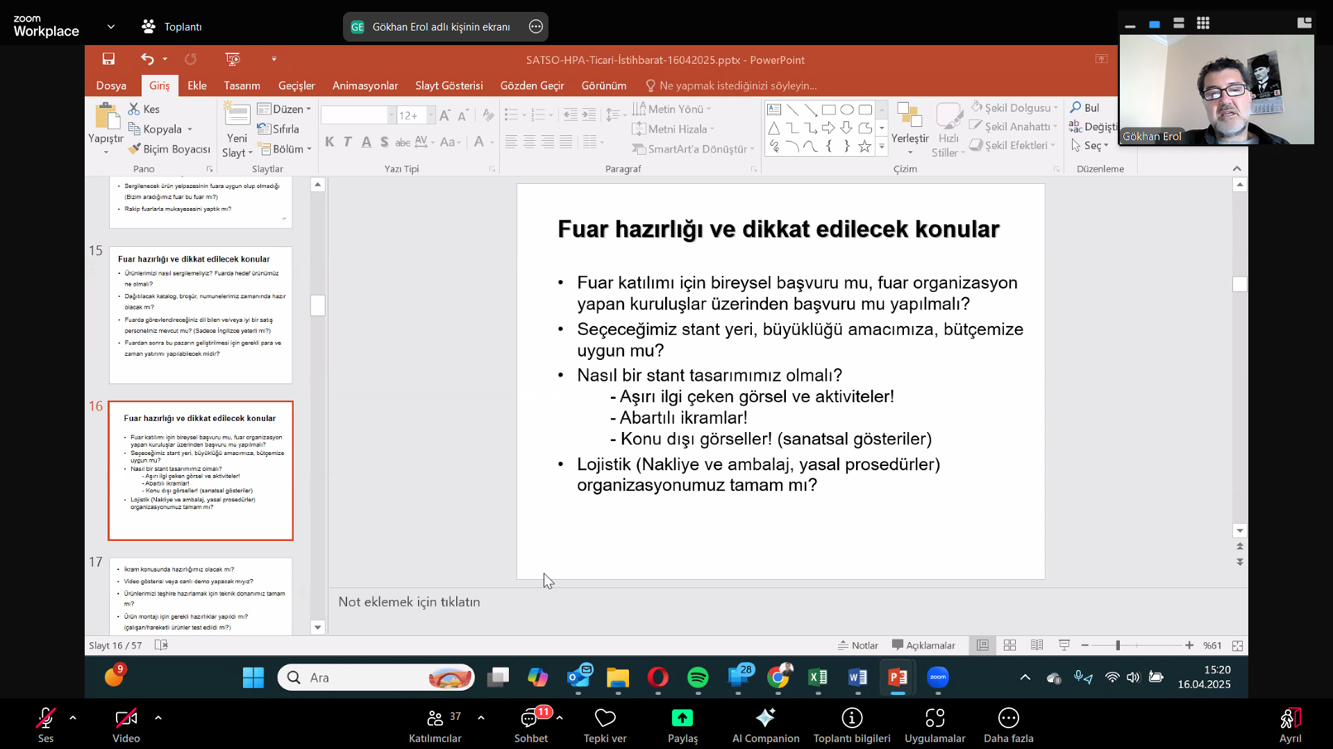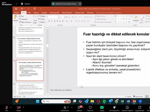 Katılımcılara, Hedef Pazar Analizi (HPA) puanı oluşturulmasında kullanılan lojistik imkanlar, kültürel yakınlık, nüfus, vergi yapısı ve GSYİH gibi kriterler hakkında bilgi verildi. Fuar seçiminin önemine vurgulayarak, fuar öncesi ve sonrası yapılacaklar iyi planlanmalıdır. Fuar sonrası çalışmalar için hazır mıyız? Personel, ürün, dış ticaret ve fuar konusunda eğitimli mi? gibi soruların cevabı bilinmelidir.” ifadeleri kullanıldı.
