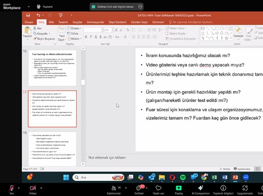 SATSO’nun resmi eğitim/seminer platformu SATSO Akademi’de gerçekleşen eğitimde, Eğitmen Gökhan EROL ve Barış YAŞBALA'nın sunumu ve anlatımıyla GTİP Numarası, Doğru Satış Kanalı Tespiti, Fuarlar, Türkiye’nin İhracatının Analizi, Yakın Pazarların Analizi, konu başlıkları altında bilgiler paylaşıldı ve merak edilenler cevaplandırıldı.