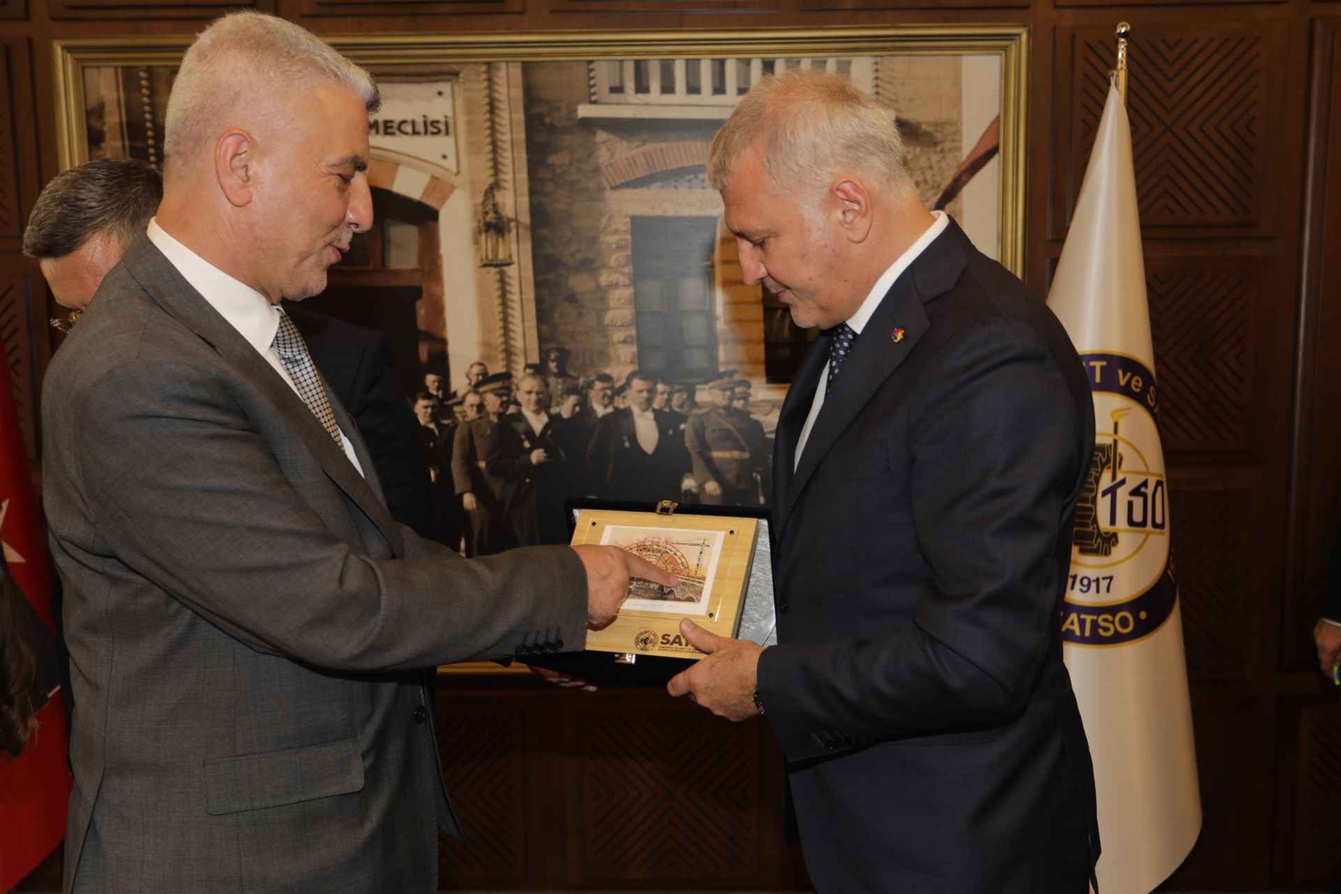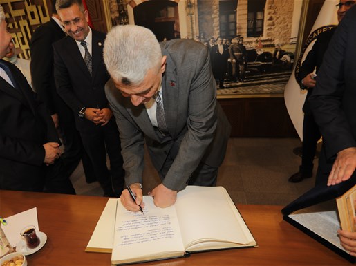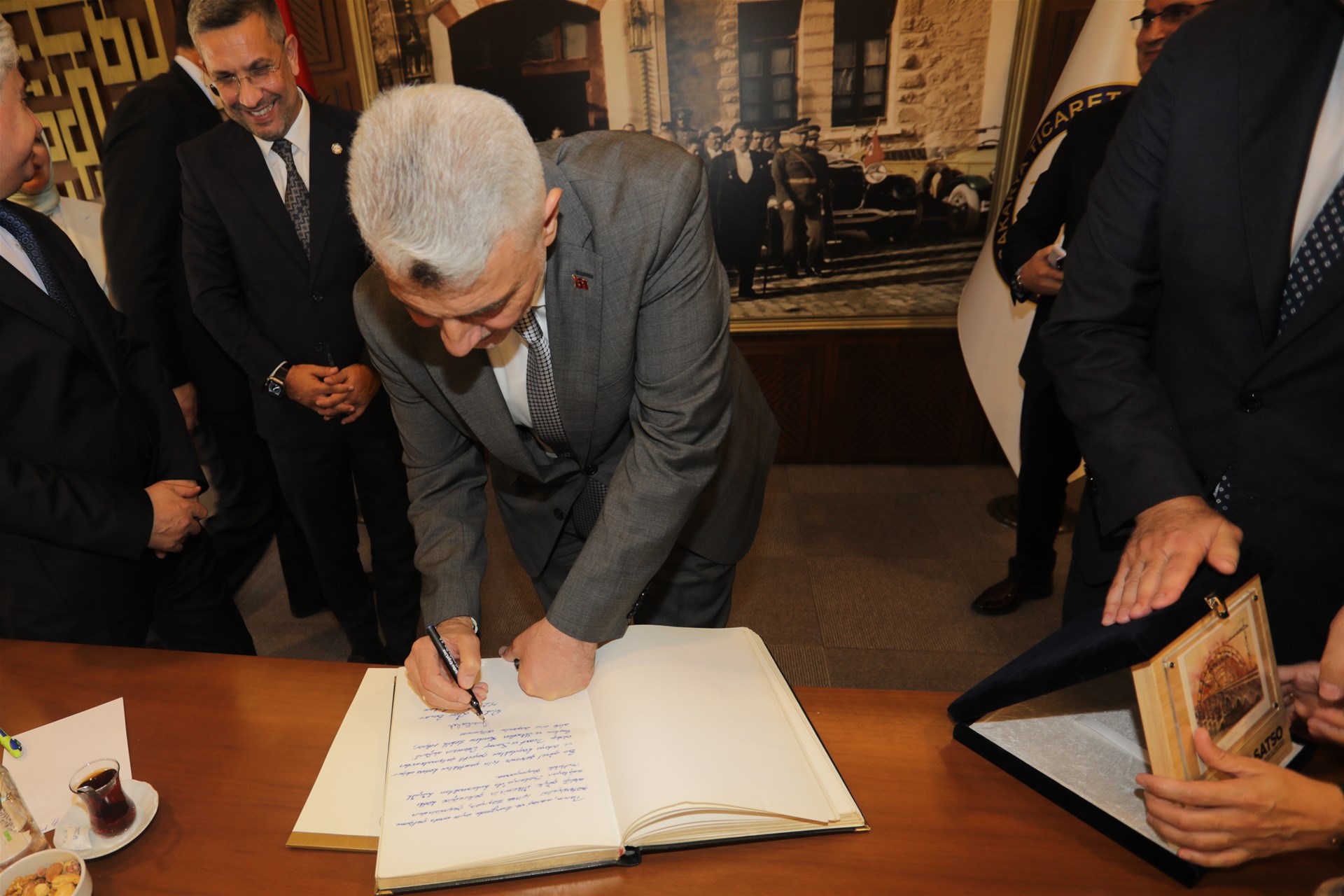 Program kapsamında, SATSO Yönetim Kurulu Başkanı A. Akgün Altuğ ve Meclis Başkanı Erdem Ercan tarafından Sayın Bakan’a günün anısına plaket takdim edildi. Ardından Bakan, SATSO Anı Defteri’ni imzaladı.
