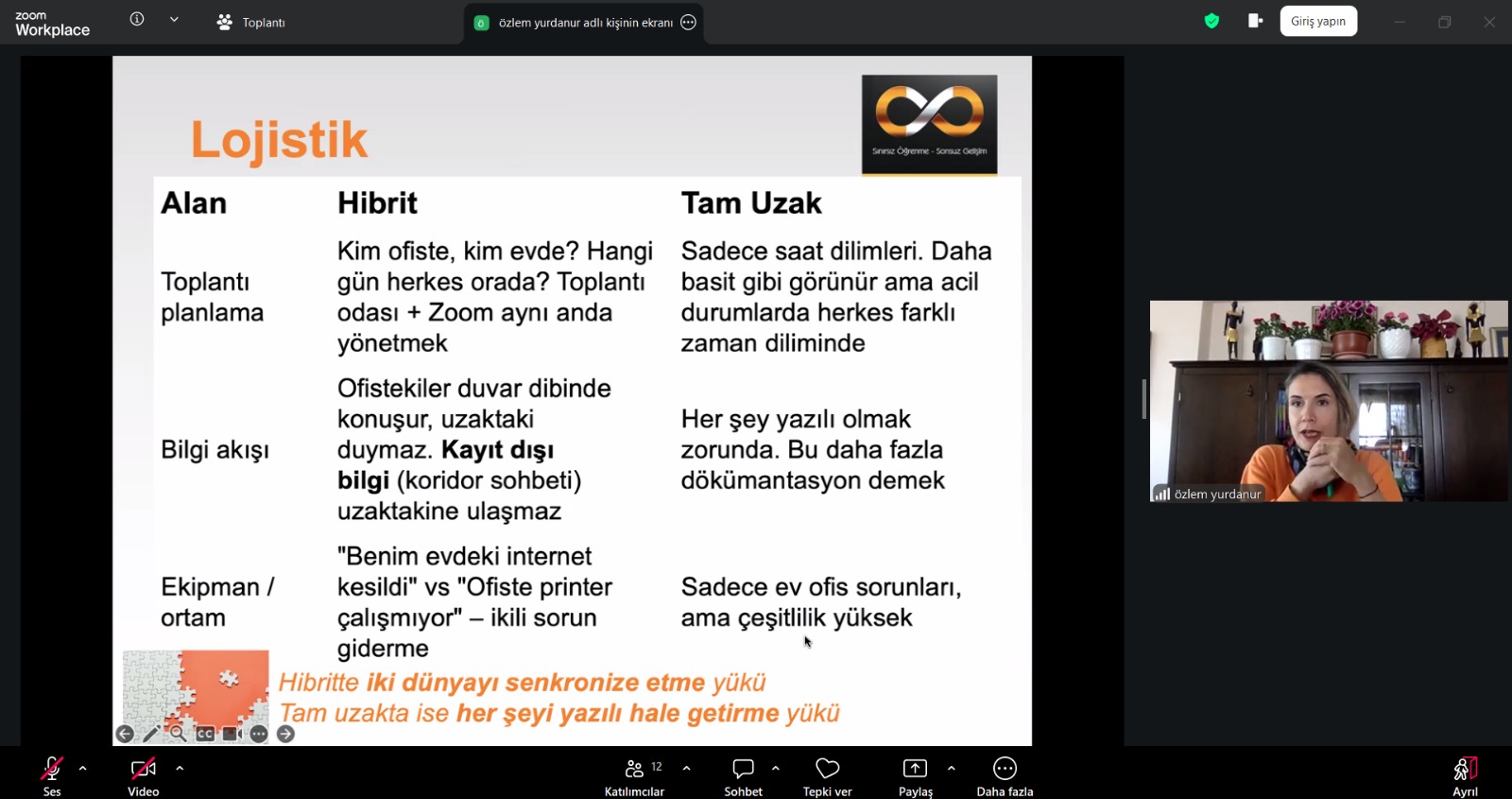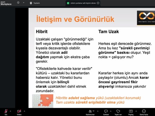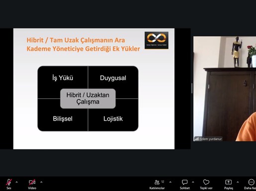 SATSO’nun resmi eğitim/seminer platformu #SATSOAkademi’de Eğitmen Özlem Yurdanur’un sunumuyla online olarak gerçekleşen eğitimde hibrit veya uzaktan çalışma modellerinde yaşanan zorluklar, performans takibi ve motivasyon gibi hususlar işlendi ve merak edilenler uygulamalı olarak cevaplandırıldı.