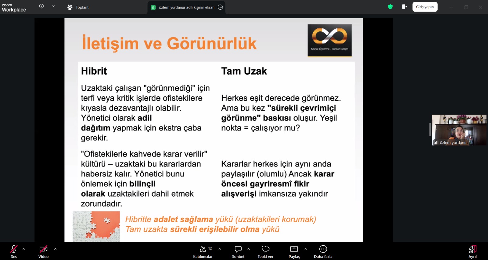 Eğitmen Özlem Yurdanur, özellikle 2020 başlarında dünyada etkisini gösteren küresel pandemi dönemi ve sonrasında uzaktan çalışmanın yaygınlaştığına dikkat çekerek, “Dijitalleşmenin hızlanmasıyla birlikte birçok kurum için uzaktan çalışma kalıcı bir modele dönüştü. Başarılı bir uzaktan ekip yönetiminde ilk adım açık ve düzenli iletişim kurmaktır. Ekip üyelerinin görevleri, beklentileri ve teslim tarihleri net biçimde tanımlanmalıdır. Haftalık toplantılar, kısa durum güncellemeleri ve doğru dijital araçların kullanımı ekip içindeki koordinasyonu güçlendirir. Bir diğer önemli unsur ise güven kültürüdür. Fiziksel olarak aynı ortamda olunmadığında çalışanların her an kontrol edilmesi yerine, sorumluluk bilinci ve sonuç odaklı çalışma teşvik edilmelidir. Ayrıca yöneticilerin ekip üyeleriyle birebir iletişim kurması da önemlidir.” diye bilgiler paylaştı.