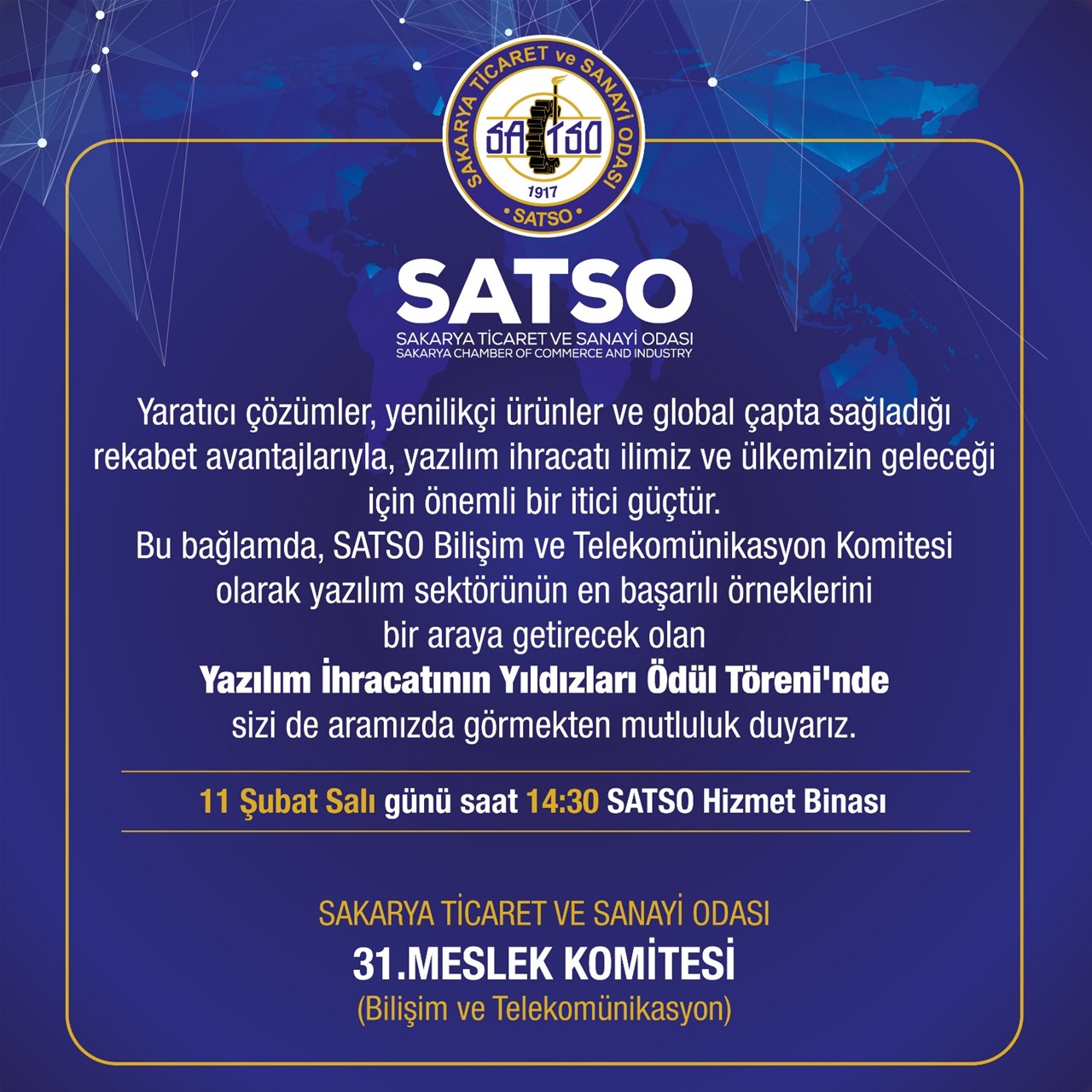 Komite tarafından yapılan açıklamada törenin sektördeki ihracatçı üyelerin motivasyonlarını artırmak ve diğer üyeleri de ihracata teşvik etme amacıyla düzenlendiği belirtilerek Sakarya’nın bu anlamda ciddi çalışmalar içinde olan bir il olduğunu, yazılım ve bilişim anlamında yapılan yatırımlarla sektörde öncü illerden biri olacağının altı çizilerek törene tüm sektör temsilcileri ve Sakaryalılar davet edildi.