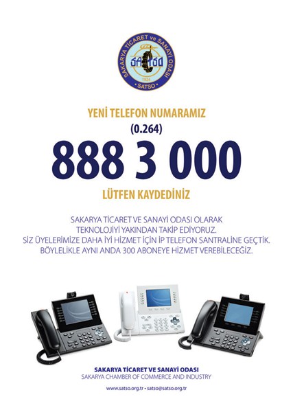 Sakarya Ticaret ve Sanayi Odası'nın (SATSO) mevcut santrali daha modern hale getirildi. 07.01.2013 Pazartesi gününden itibaren üyeler SATSO'ya 0264 888 3 000 nolu telefon numarasından ulaşacaklar.