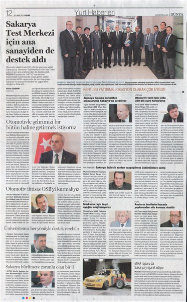 Otomotiv Test Merkezi'ni Sakarya'ya isteyen Sakarya Ticaret ve Sanayi Odası (SATSO), Dünya Gazetesi ile otomotiv sektörünün önde gelen yatırımcılarını bir araya getirdi. SATSO Yönetim Kurulu Başkanı Mahmut Kösemusul'un başkanlığında gerçekleşen toplantı Dünya Gazetesi'nde tam sayfa yer buldu.