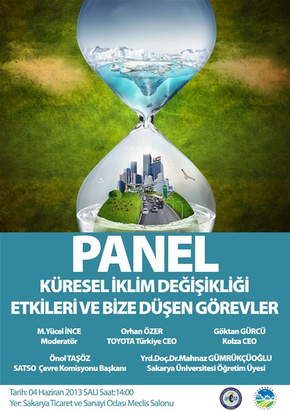 04 Haziran Salı günü (yarın) saat 14.00'te SATSO Meclis Salonunda Sakarya Büyükşehir Belediyesi'nden M. Yücel İnce Moderatörlüğünde gerçekleştirilecek “Küresel İklim Değişikliği, Etkileri Ve Bize Düşen Görevler” konulu panele, Toyota Türkiye CEO'su Orhan Özer, Kolza CEO'su Göktan Gürcü, SATSO Çevre Komisyonu Başkanı Önol Taşöz, Sakarya Üniversitesi Öğretim Üyesi Yrd. Doç.Dr. Mahnaz Gümrükçüoğlu panelist olarak katılacaklar.