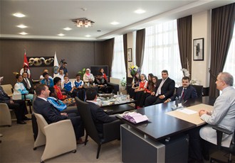 Türkçe Olimpiyatları Sakarya ayağı için ilimizde bulunan ve dünyanın çeşitli bölgelerinden ilimize gelen öğrenciler Sakarya Ticaret ve Sanayi Odası Yönetim Kurulu Başkanı Mahmut Kösemusul'u ziyaret etti.
