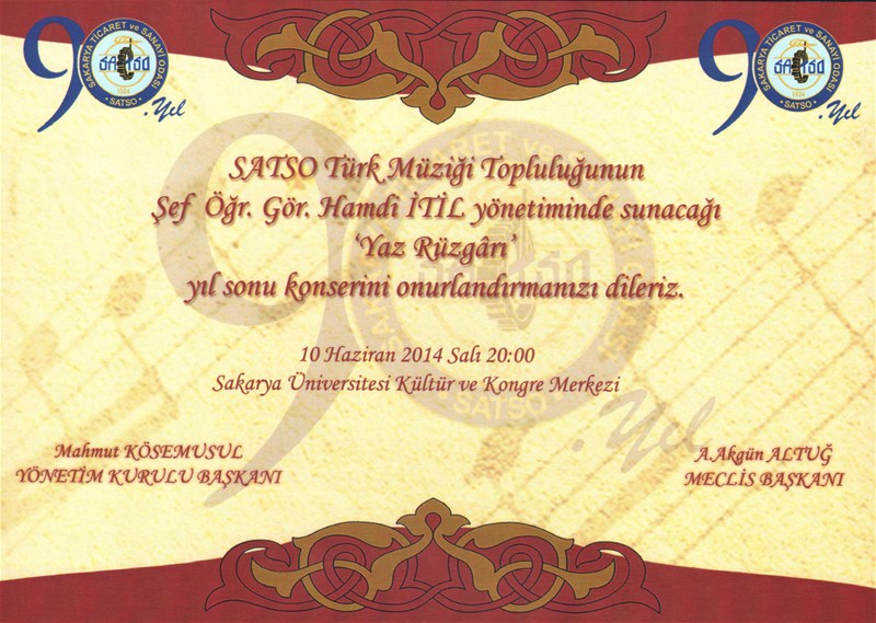 Sakarya Üniversitesi Kültür ve Kongre Merkezinde 10 Haziran 2014 Salı günü saat 20.00 başlayacak konserde SATSO Türk Müziği Topluluğu toplam 16 eserden oluşan eserleri seslendirecek.