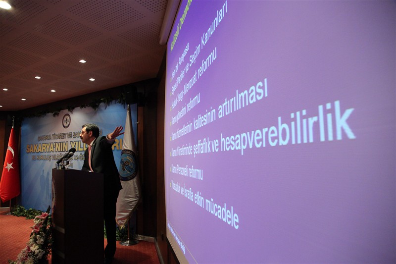 "Şehrimizde de çok düzeyli bir birlikteliğimiz var. Başta sayın Valimiz, büyükşehir belediye başkanımız ve SATSO başkanımızın başkanlığında Sakarya ekonomisinin bugününe ve yarınlarına yön vermeye bir vizyon belirlemeye çalışıyoruz. Daha dün sayın valimiz başkanlığında 2023 Sakarya vizyonunu konuştuk, tartıştık ve tartışmaya devam edecek. İş adamlarımızın, esnaflarımızın sıkıntılarını biliyoruz. Buralardan aldığımız bilgileri değerlendirip bakanlarımıza ve sayın Başbakanımıza iletiyoruz ve iletmeye de devam ediyoruz."