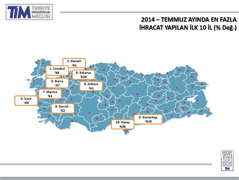 İlimiz ihracatı, Geçen yıl ilk 7 ay ile bu yılın ilk 7 ayını oranladığımızda ise %48,27 artış yaşanmıştır. Geçen yılın Temmuz ayı ile 2014 Temmuz ayının oranladığımızda bu yıl geçen yıla göre %16,0 artış yaşanmıştır. Sakarya’nın büyümesi demek Türkiye’nin Büyümesi demektir