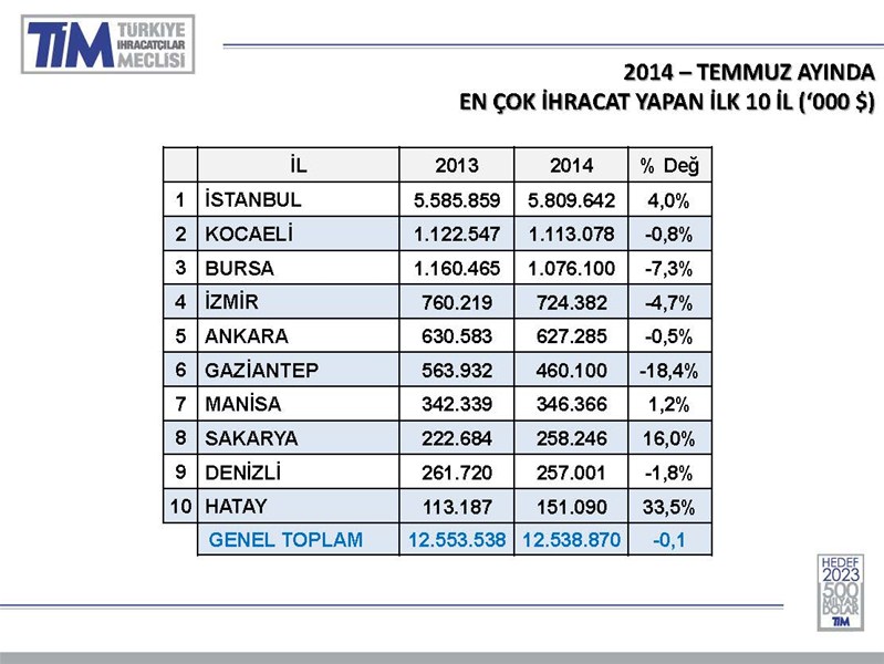 Sakarya’nın 2014 ilk 7 aylık toplam ihracat rakamı 1.704.895,74 (000 $) olarak netleşti. 2013 ‘de ise ilk 7 aylık toplam ihracatı 1.150.343,34(000 $) idi. Geçen yılın Temmuz ayı ile 2014 Temmuz ayının oranladığımızda bu yıl geçen yıla göre %16,0 artış yaşandı.