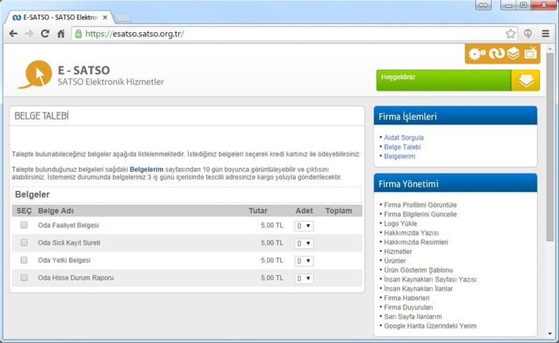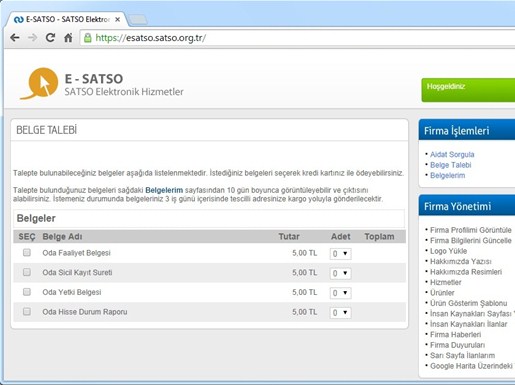 Hizmetle ilgili bilgi veren Başkan Kösemusul, “Odamız web sayfası üzerinden (www.satso.org.tr) e-SATSO’ya (esatso.satso.org.tr) giriş yapan üyelerimiz, aidat ödemelerini üye olmadan Oda Sicil Ticaret Sicil numaralarıyla yapabileceği gibi, kurumsal üye olarak giriş yaptıklarında geçmiş ödemelerini görüntüleyebilecekler ve “Oda Faaliyet Belgesi, Oda Sicil Kayıt Sureti, Oda Yetki Belgesi, Oda Hisse Durum Raporu” belgelerini de artık internet üzerinden belge ücretini ödeyerek talep edebilecekler. Onaylanan belgeyi üyelerimiz isterse ekrandan görerek bilgisayarlarına indirebildiği gibi, istenilen sayıda belgeyi tescilli adreslerine postalanmasını da talep edebiliyor” şeklinde konuştu.