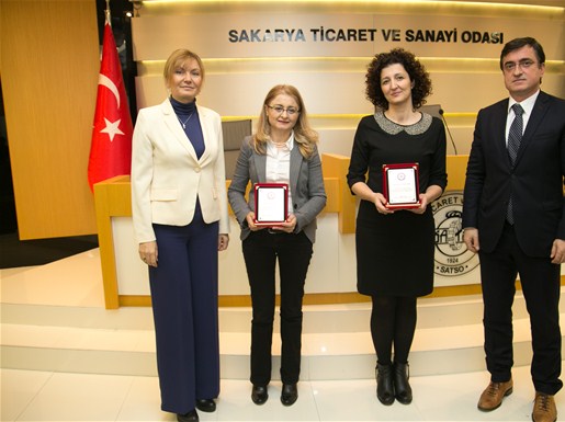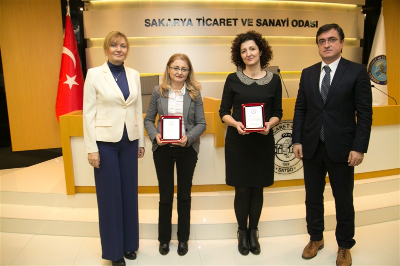 Sertifika töreninden önce projede emeği geçen koordinatör ve akademisyenlere teşekkür plaketlerini SATSO Yönetim Kurulu Başkan Yardımcısı Orhan Yılgenci ve İcra Komitesi Başkanı İffet Hacıeyüpoğlu takdim etti.