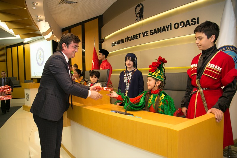Günün anlam ve önemine ithafen konuk çocuklara hediye takdiminde bulunan SATSO Yönetim Kurulu Başkan Yardımcısı Orhan Yılgenci’ye öğrenciler de ülkelerinin simgesi yöresel hediyeler takdim ettiler.