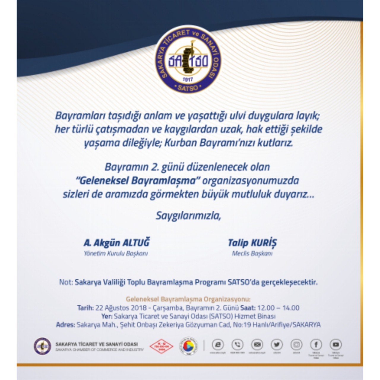 SATSO Geleneksel Bayramlaşma Töreni, 22 Ağustos 2018 Çarşamba günü (bayramın 2. Günü) 12.00-14.00 saatleri arasında SATSO Hizmet Binası Bahçesinde gerçekleştirilecek. Sakarya Valiliğimizin Toplu Bayramlaşma Törenini de içeren programımıza tüm üyelerimizin teşriflerini bekler, katılımlarından memnuniyet duyarız”