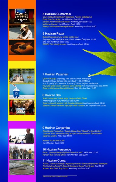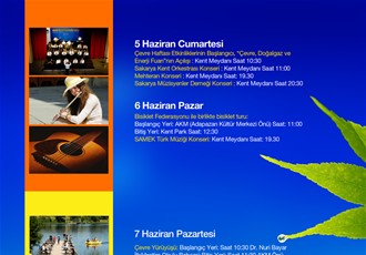 Etkinliğin ikinci gününde(6 Haziran) Bisiklet Federasyonu ile AKM'nin önünden başlayacak olan Bisiklet Turu Knet Parkta sona erecek. Etkinliğin üçüncü gününde (7 Haziran) Çevre Yürüyüşü ile Poyrazlar Gölü Tanıtım organizasyonları yapılacak. Etkinliğin dördüncü gününde (8 Haziran) atık pil ve atık kağıt yarışmasının ödül töreni yapılacak. Etkinliğin beşinci gününde (9 Haziran) Atlas Dergisi fotoğrafçısı Cengiz Hakan Öge'nin “Mardek” isimli teknesiyle çıktığı dünya turu izlenimleri “Dia Gösterisi” eşliğinde katılımcılarla paylaşılacak. Etkinliğin altıncı gününde (10 Haziran) AKM'de Çevreye Bakışta Eğitimin Önemi ve Yeri” konulu panel düzenlenecek. Etkinliğin son günü olan 11 Haziran'da Sakarya Büyükşehir Belediyesi Atık Su Arıtma Tesisi ve Düzenli Depolama Sahası'na teknik gezi yapılması planlanıyor.