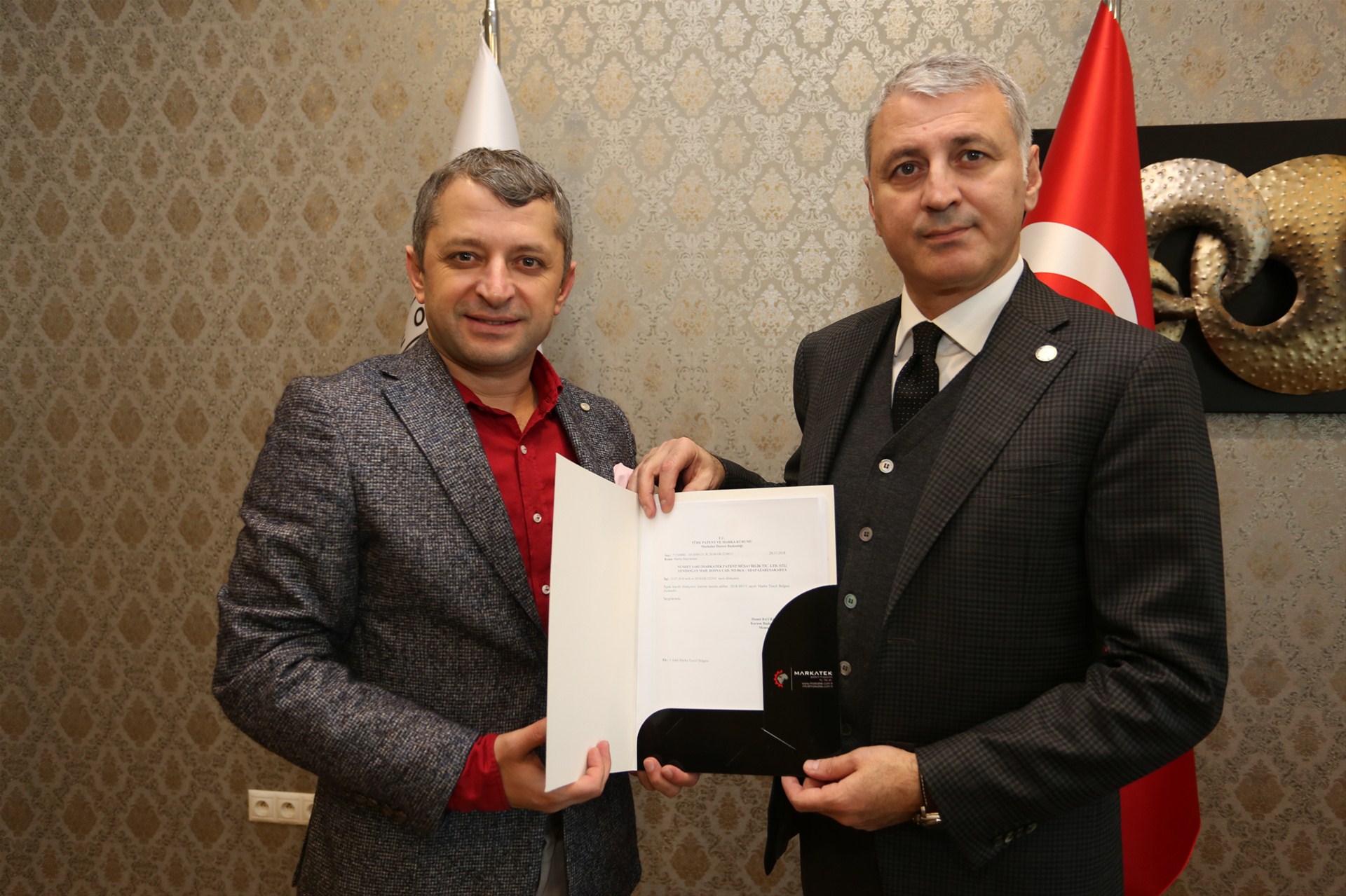 SATSO Ticareti Araştırma ve Geliştirme Komisyonu tarafından çalışmaları yürütülen şifremiz54 Projesi kapsamında alınan Patent Belgesi, Komisyon Üyesi Baki Demir tarafından SATSO Yönetim Kurulu Başkanı A. Akgün Altuğ’a teslim edildi.