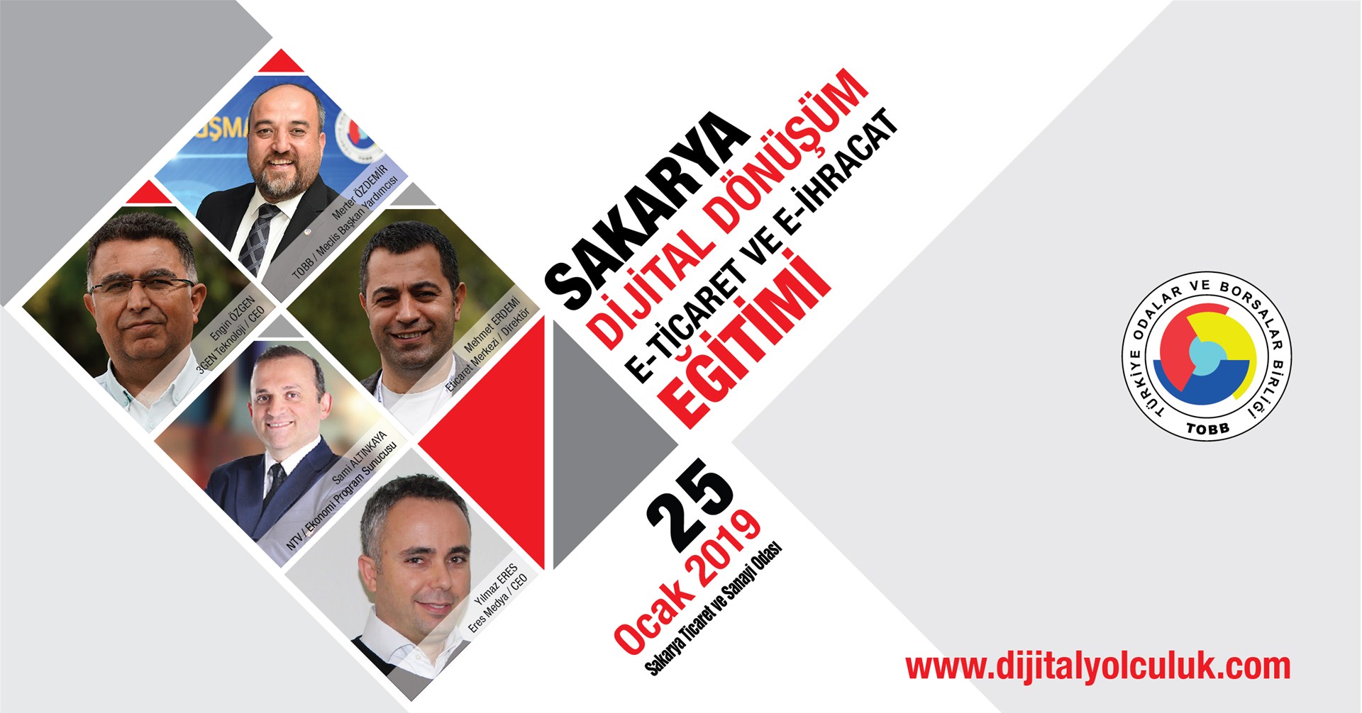 E- Ticaret Merkezi Genel Koordinatörü Sami Altınkaya moderatörlüğünde; TOBB Meclis Başkan Yardımcısı Merter Özdemir, Eticaret merkezi Direktörü Mehmet Erdemi, GEN teknoloji CEO’su Engin Özgen3, Eres Medya CEO’su Yılmaz Eres’in katılacağı eğitim semineri 25 Ocak 2019 Cuma günü 09.00-19.00saatleri arasında SATSO’da gerçekleştirilecek.