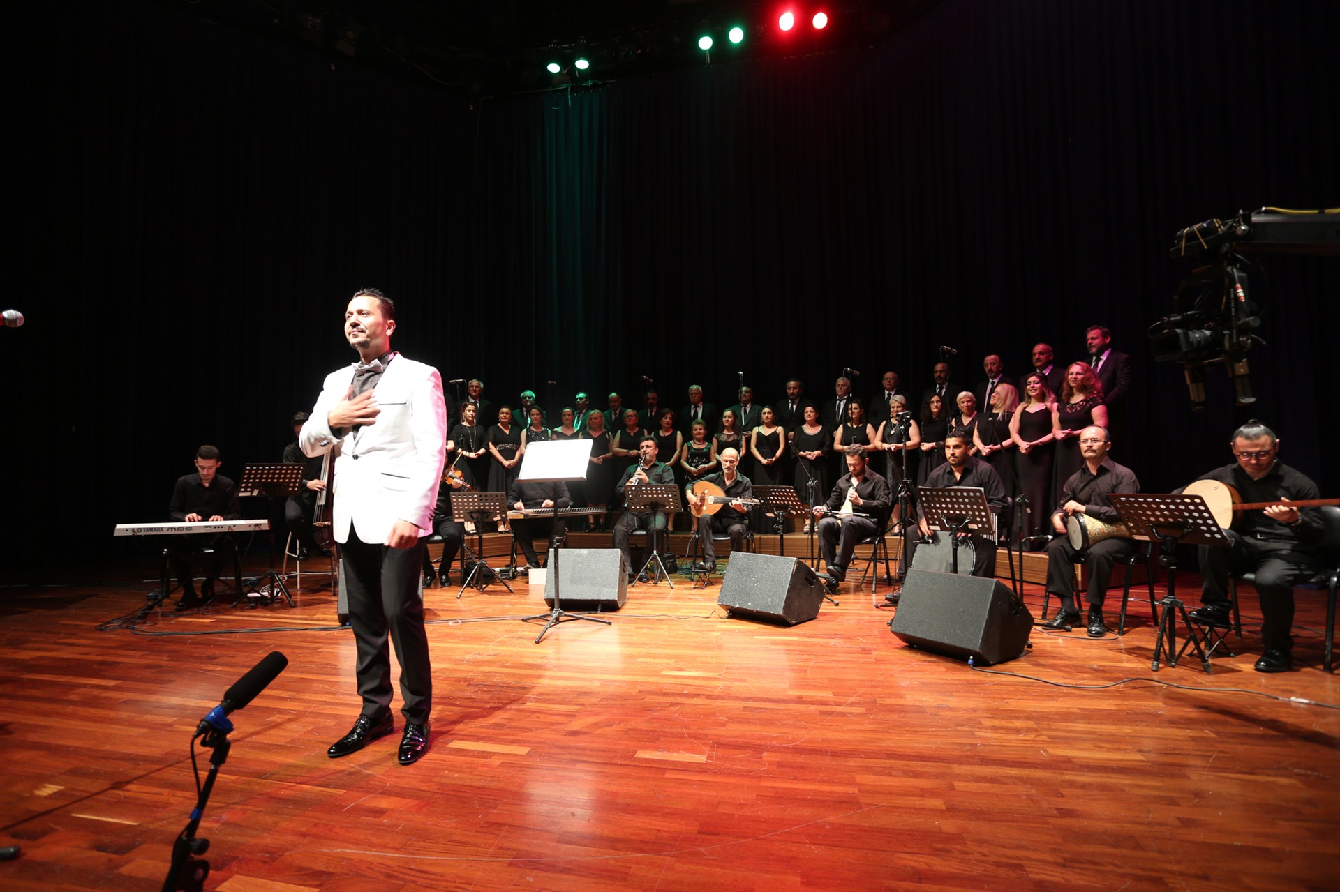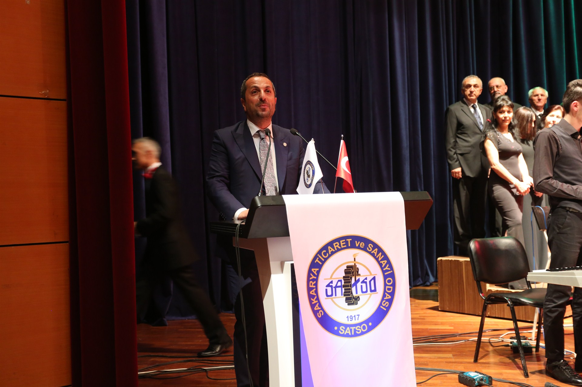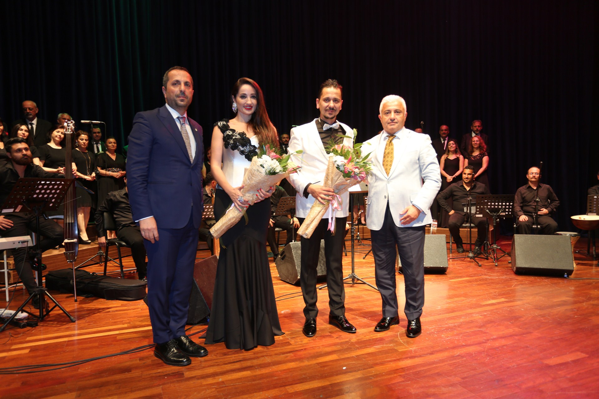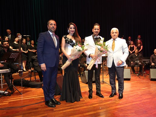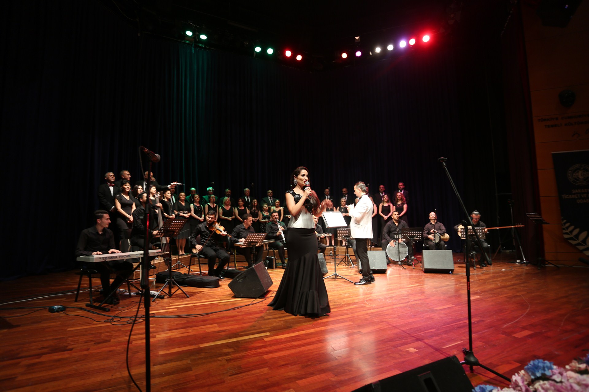 SATSO Korosu ile de sanat müziğinin eşsiz eserlerine icra ettiği gecede çiçek takdim etmek üzere sahneye gelen SATSO Meclis Başkanı Talip Kuriş;