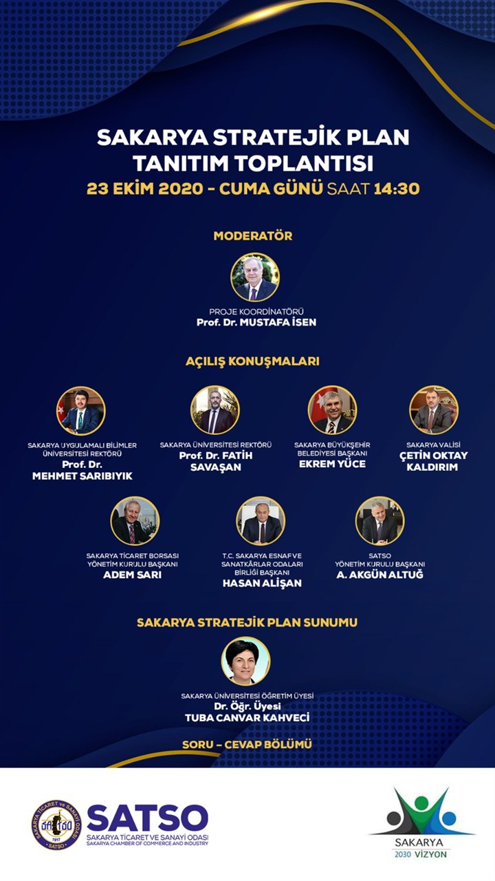 Sakarya Stratejik Planı’nın detaylarının açıklanacağı ve kamuoyuna sunulacağı lansman toplantısı 23 Ekim 2020 Cuma günü saat 14.30’da video konferans yoluyla online olarak gerçekleştirilecektir.