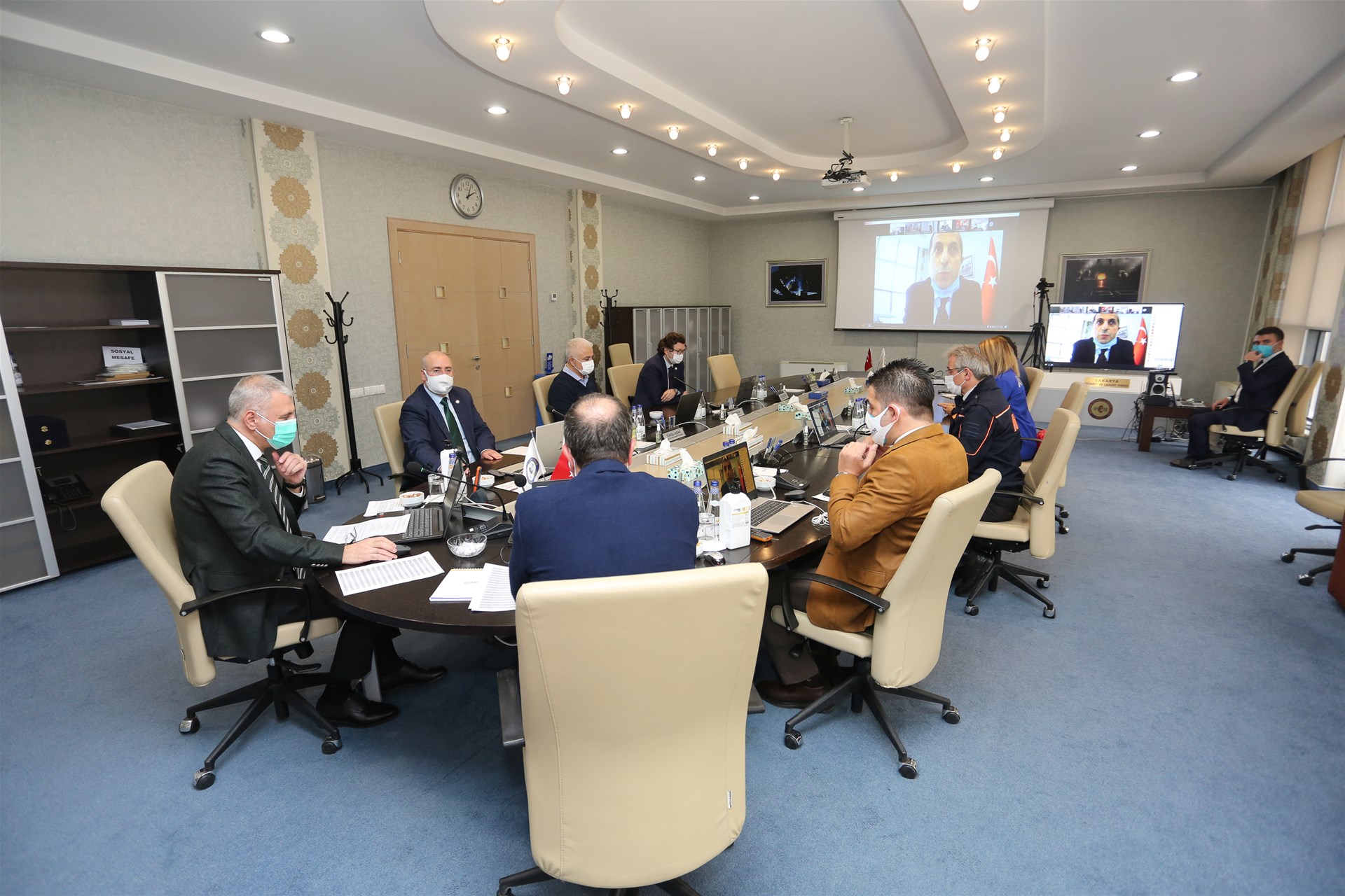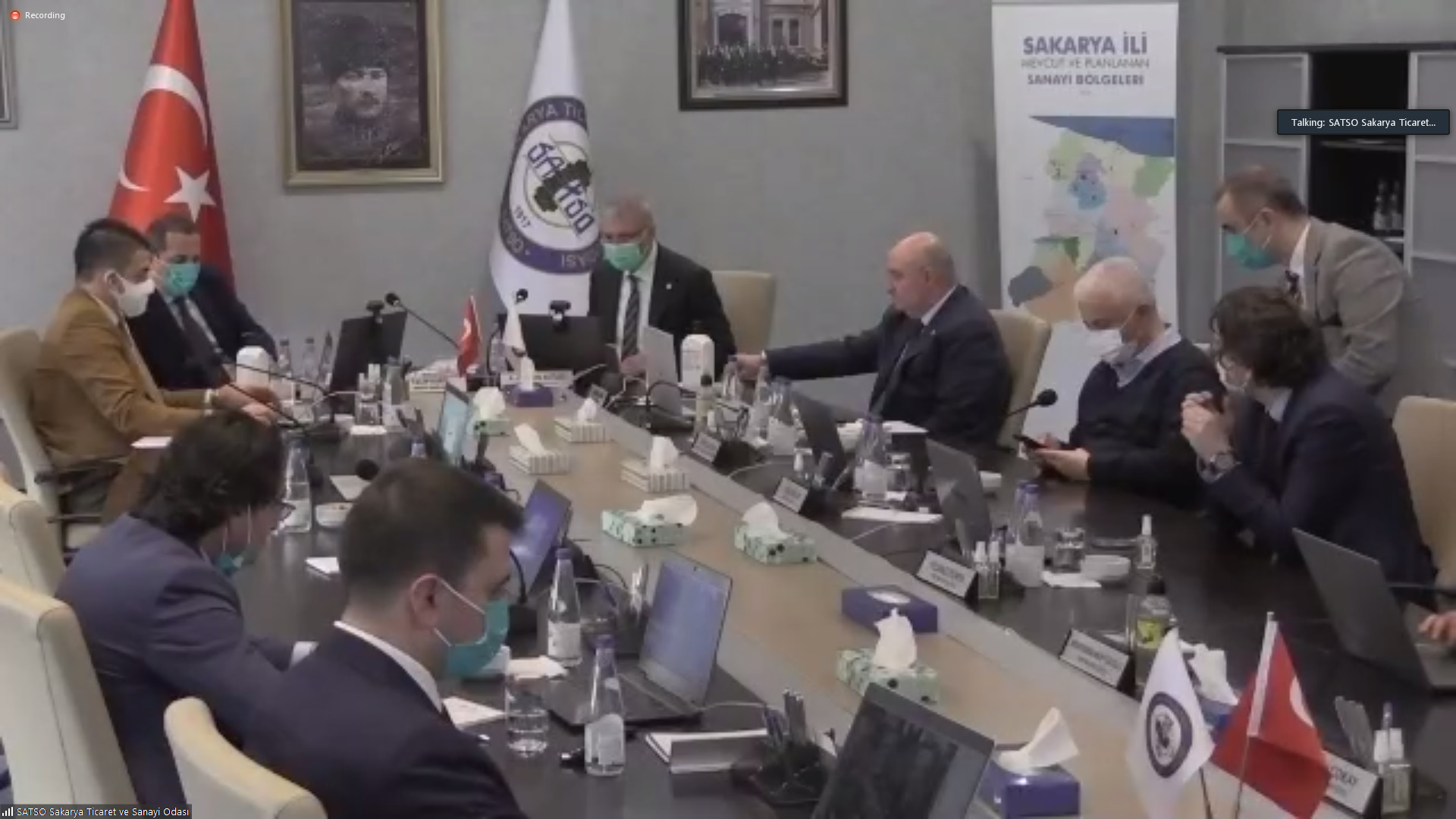 SATSO Yönetim Kurulu Başkanı A. Akgün Altuğ ve Meclis Başkanı Talip Kuriş ve Yönetim Kurulu Başkan Yardımcısı Yüksel Avşar, Yönetim Kurulu Sayman Üyesi Doğan Çatalbaş ile toplantıya davetli olarak sunum yapmak için katılan Sakarya İl Afet ve Acil Durumu Müdürü Hüseyin Kaşkaş’ın Oda Hizmet Binasından katıldığı toplantıya 34 Meslek Komitesinin temsilcileri ile meclis üyeleri de online olarak iştirak etti.