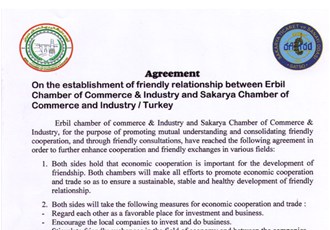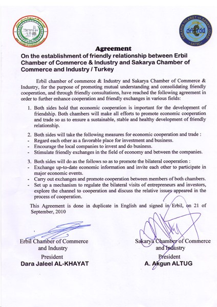 Ayrıca Sakarya Ticaret ve Sanayi Odası ile Erbil Ticaret ve Sanayi Odası arasında karşılıklı görüşmelerde anlayış, dostluk ve işbirliğini sağlamlaştırmak ve artırmak amacıyla bir “İyi niyet Mektubu” da imzalandı.