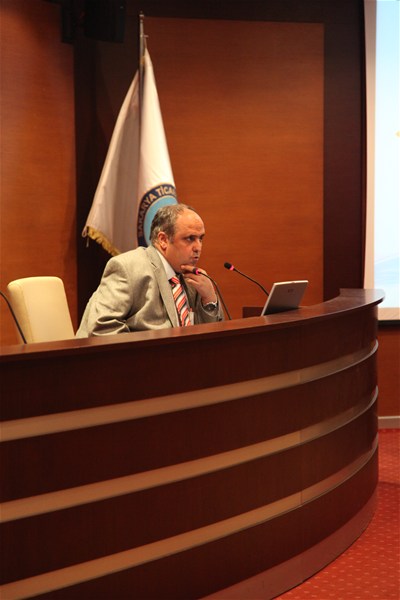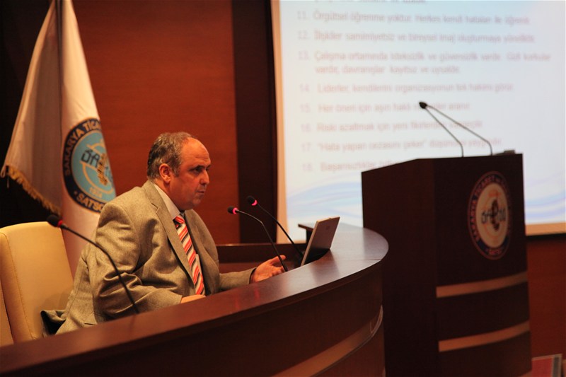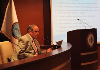 Öztemel Hoca konuşmasında Sağlıklı Organizasyonlar ile Sağlıksız Organizasyonların özelliklerinden bahsetti. Sağlıksız Organizasyonların Sağlıklı bir yapıya kavuşabilmeleri için kendilerini sağlıksız yapan unsurları ve problemleri belirlemelerini, bu problemlere Üniversiteden alacakları danışmanlık destekleriyle çözüm aramalarının çok önemli olduğunu belirtti.
