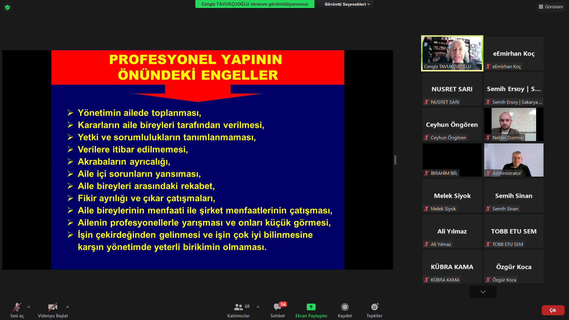 Webinar platformu üzerinden online olarak gerçekleştirilen eğitimde, Dr. Cengiz Tavukçuoğlu, Aile Şirketlerinin Temel Karakteristikleri, Aile Şirketlerinde Yönetim Sorunları ve Yok Olma Nedenleri, Kurumsallaşmada Sıklıkla Karşılaşılan Problemler gibi birçok konuda detaylı bilgileri SATSO Üyeleriyle paylaştı.