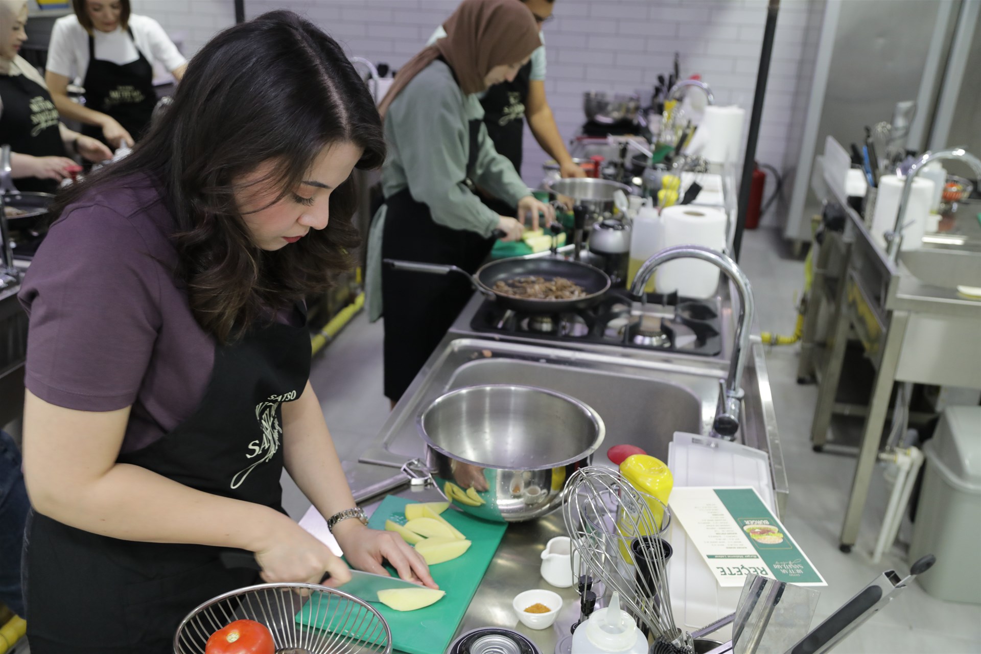 Mutfak severlerin katılımıyla SATSO Mutfak Sanatları Akademisi’nde gerçekleşen burger workshop’unda katılımcılar lezzetli bir burger’in yanı sıra fırında patates ve acılı mayonez lezzetlerini de hazırladı.