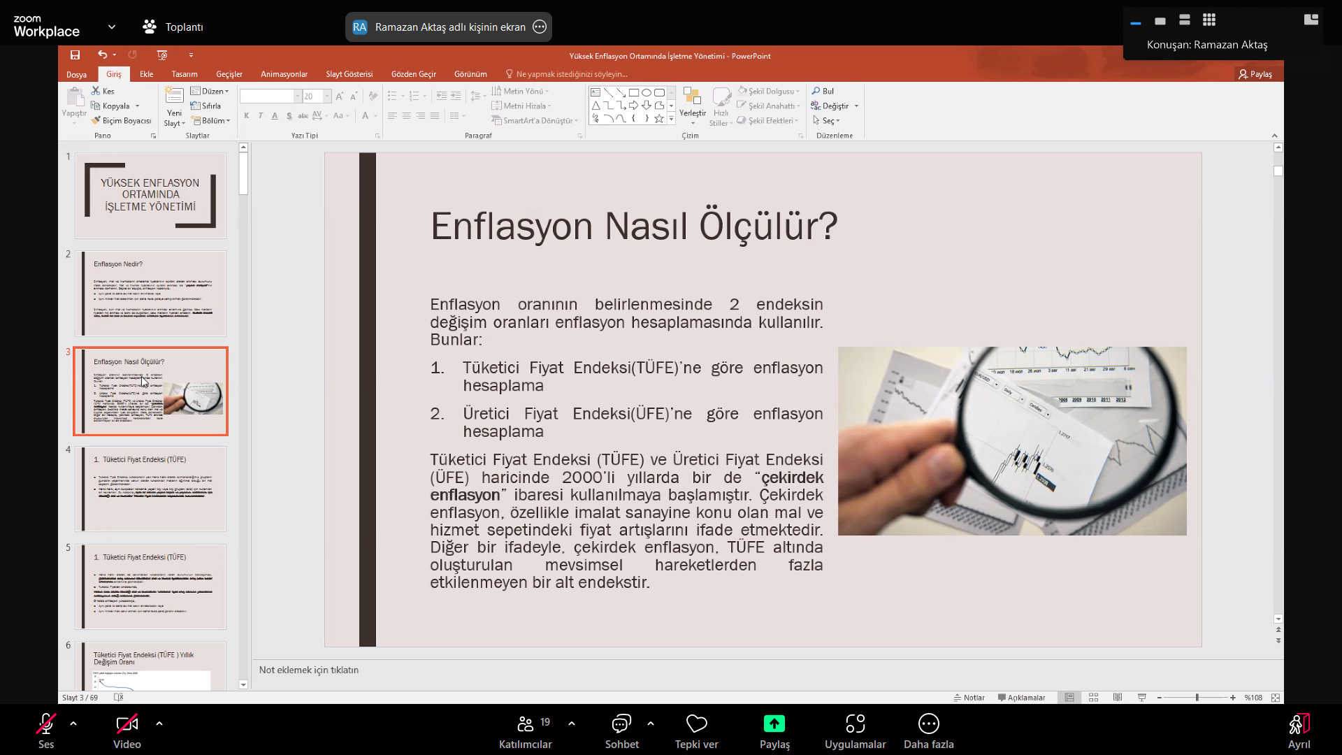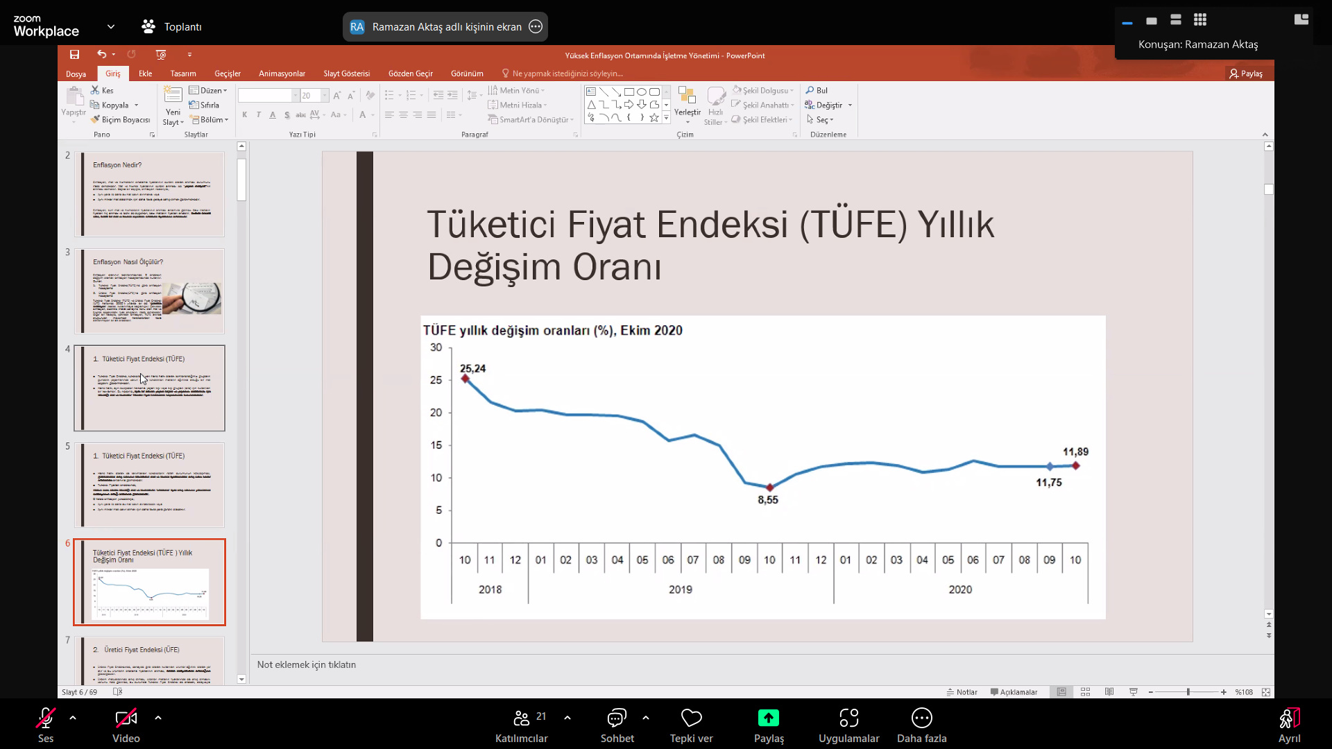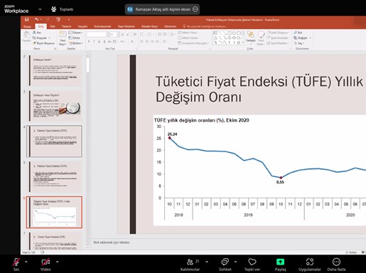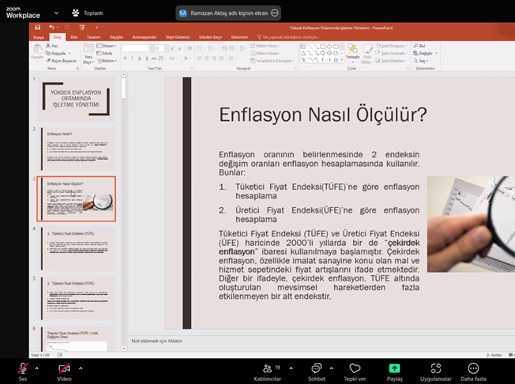 Eğitmen Eğitmen Prof. Dr. Ramazan Aktaş‘ın sunumuyla gerçekleşen eğitimde enflasyon nedir? nasıl ölçülür? enflasyonun maliyetleri, fiyat istikrarı nedir? faydaları nelerdir?, Türkiye’de enflasyon sürecinin dinamikleri: enflasyonun temel nedenleri, fiyat istikrarının sürdürülmesi için gerekenler, KOBİ’ler bankacılık ve banka kredileri, yüksek enflasyon ve işletmeler, yüksek enflasyonun pazarlama üzerine etkileri, yüksek enflasyonun üretim üzerine etkileri, yüksek enflasyonun işletme finansmanı üzerine etkileri, yüksek enflasyonun insan kaynakları yönetimi üzerine etkileri konuları hakkında ayrıntılı bilgiler paylaşıldı, merak edilenler cevaplandırıldı.