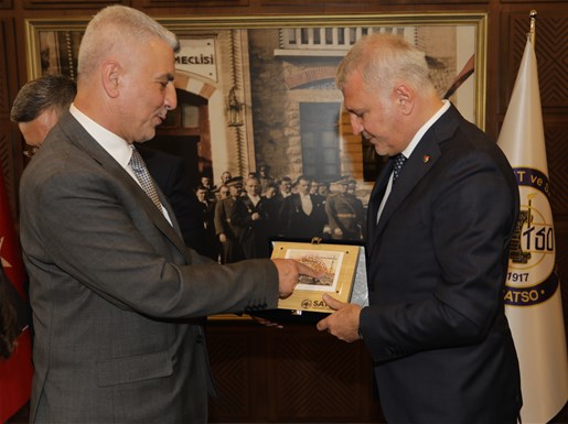 Program kapsamında, SATSO Yönetim Kurulu Başkanı A. Akgün Altuğ ve Meclis Başkanı Erdem Ercan tarafından Sayın Bakan’a günün anısına plaket takdim edildi. Ardından Bakan, SATSO Anı Defteri’ni imzaladı.