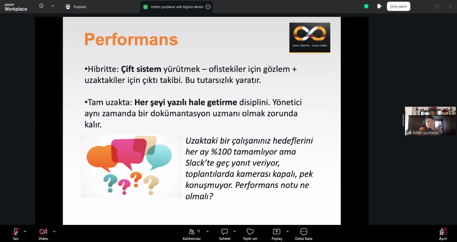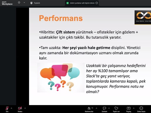 SATSO’nun resmi eğitim/seminer platformu #SATSOAkademi’de Eğitmen Özlem Yurdanur’un sunumuyla online olarak gerçekleşen eğitimde hibrit veya uzaktan çalışma modellerinde yaşanan zorluklar, performans takibi ve motivasyon gibi hususlar işlendi ve merak edilenler uygulamalı olarak cevaplandırıldı.