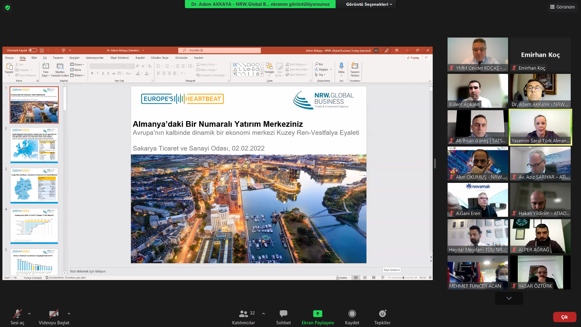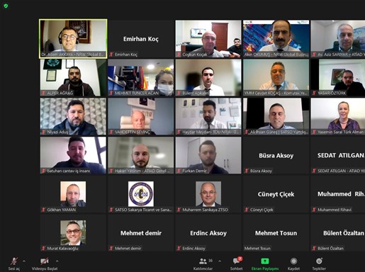 Webinar platformunda düzenlenen toplantı Yurtdışı İş Geliştirme Komisyonu Başkanı Ali İhsan Güneş ve komisyon üyelerinin sahipliğinde NRW Global Business Türkiye Yatırım Danışmanlığı Temsilcisi Dr. Adem Akkaya ile Akın Okumuş, Türk Alman İş İnsanları ve Sanayicileri Derneği (TDU) Yönetim Kurulu Başkan Vekili Yasemin Saral, Avrupa Türk İş İnsanları ve Sanayiciler Derneği Yönetim Kurulu Başkanı Av. Aziz Sarıyar, Komutax Mali Müşavirlik Temsilcisi Cevdet Koçaş’ın katkıları ve SATSO Üyesi firma temsilcilerinin katılımıyla gerçekleştirdi.