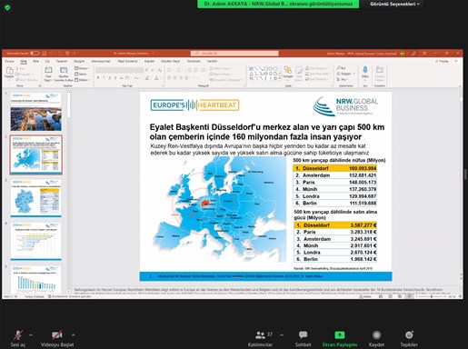 Devam eden toplantıda eyalet ile ilgili tanıtımları ve sunumu gerçekleştiren Dr. Adem Akkaya, yatırım ve işbirlikleri için bölgenin avantajları, demografik yapısı, konumu gibi birçok bilgiyi katılımcılarla paylaştı. Dr. Akkaya, “Kuzey Ren Vestfalya Almanya’da en fazla doğrudan yatırım alan eyalettir ve dünyanın en büyük fuar bölgesidir. En güçlü, en yüksek GSYH’i olan, 9.6 milyon çalışanıyla birçok ülkeden daha fazla üreten ve kazanan, dış ticaret hacmi 398 milyar Euro’dan fazla olan bir eyalettir. Türk firmalar da son yıllarda ciddi firma kuruluşu gerçekleştirerek yatırım yapıyorlar. Almanya’da ikamet eden her 3 Türk’ten 1’i bu eyalette yaşıyor. Almanya’dan Türkiye’ye gelen mal ve hizmetlerin yüzde 19’u, Türkiye’den Almanya’ya giden mal ve hizmetlerin de yüzde 25’ini oluşturuyor. Eyalette yerleşik yaklaşık 700 Türk firması mevcuttur. Almanya Türkiye’nin en büyük ticari ortağıdır. Türk firmalarından yapılan yatırımların yüzde 50’den fazlası bu bölgeye yapılmaktadır.” diyerek birçok spesifik bilgiler paylaştı.